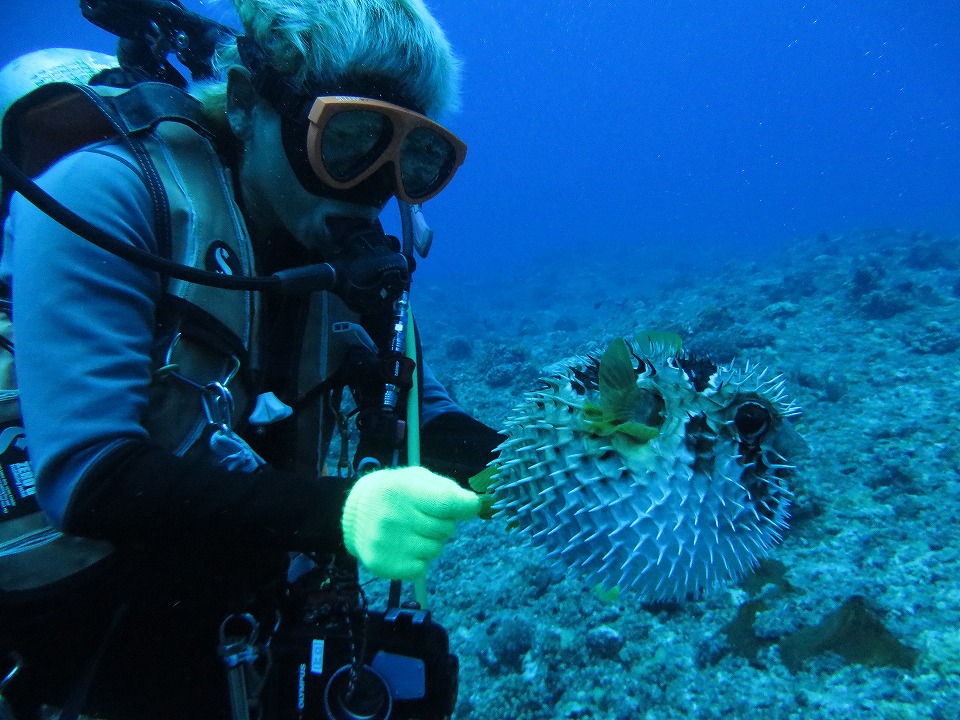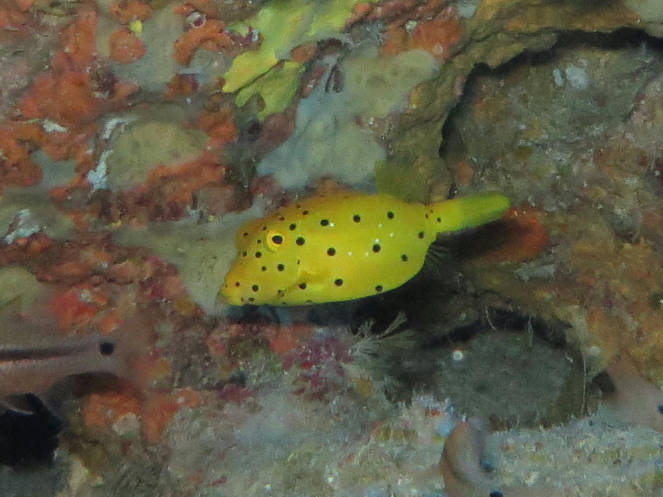 | 祖内沖で潜る。 おお~っ、俺の大好きなミナミハコフグ(yg)だぁ! ygといっても5~6cmぐらいある大きめのygだった(笑)。 |