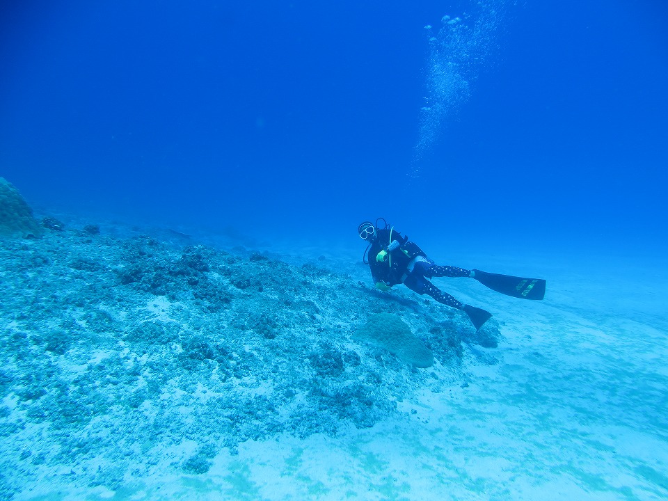 | 1本目は久部良バリで潜る。 ガイドのゆかちゃんが深場にピグミーシーホースを探しに行ってくれたが、 残念ながらいなかった。 |
