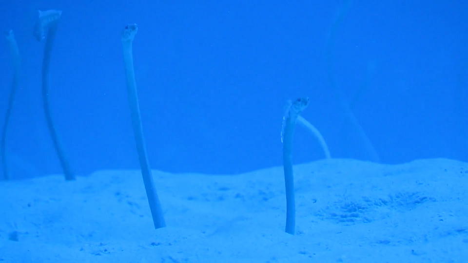 | 砂地にはホワイトスポッテッドガーデンイールがにょろにょろしていた。 約18秒の動画はこちら。 |