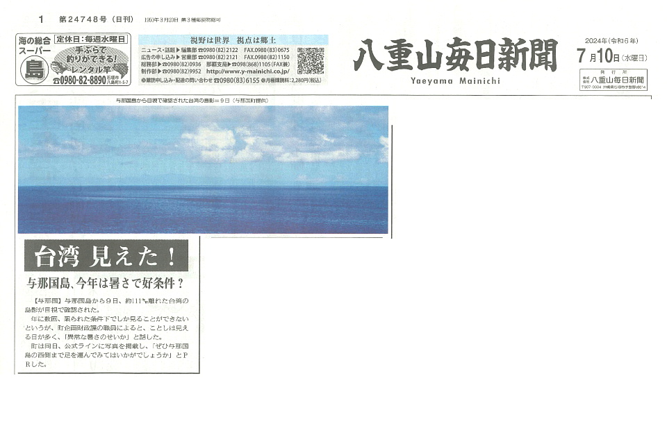 | 与那国島から台湾が見えたという記事が、 八重山毎日新聞に1面トップで載ったよ 台湾が見えるというのは、新聞記事になるぐらいの出来事なんだね。 まぁ、毎回じゃないだろうけど(笑)。 |