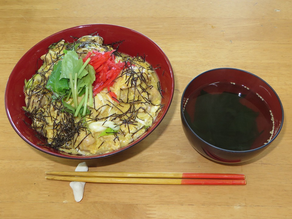 | 昼メシ。 親子丼を欲かいて大盛にしてもらったら、かなりヘヴィだった。 でも、"親子"の火の通し方(なんか残虐な書き方だな。)が絶妙で、でーじまーさんよー。 |