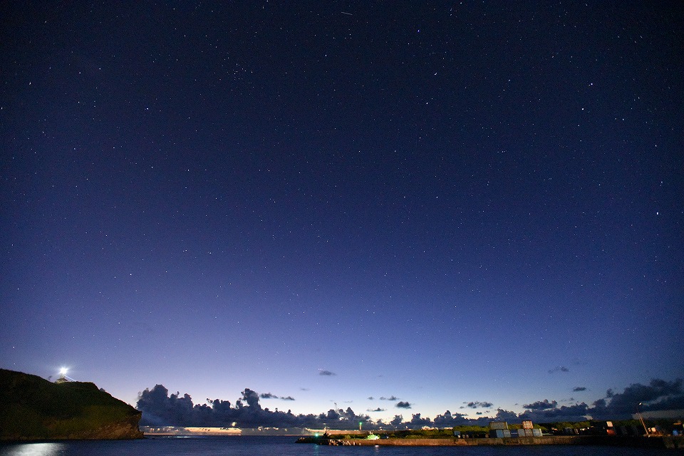 | 花火まで1時間を切ったので、場所の確認とアングルの確認をするために カメラを持ってナーマ浜に来た。 写真は、20:44に撮影。 ISO8000 17mm f2.8 3秒 写真左端は西埼灯台。 中央上端辺りには人工衛星の軌跡が写っている。 そしてそのすぐ右下には、柄を上にしてタテに北斗七星。 |