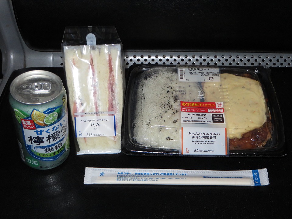 | 横浜から京急で羽田空港第3ターミナルに移動して、 ハイカロリー弁当+酒で夜食。夜食といっても今回は信州で晩メシにありつけなかったんで、 これは晩メシと夜食を兼ねている。 喰い終わったら、ベンチでごろ寝だ。これも寝台特急「サンライズ」同じく「非日常」で、結構楽しいのよね。 |