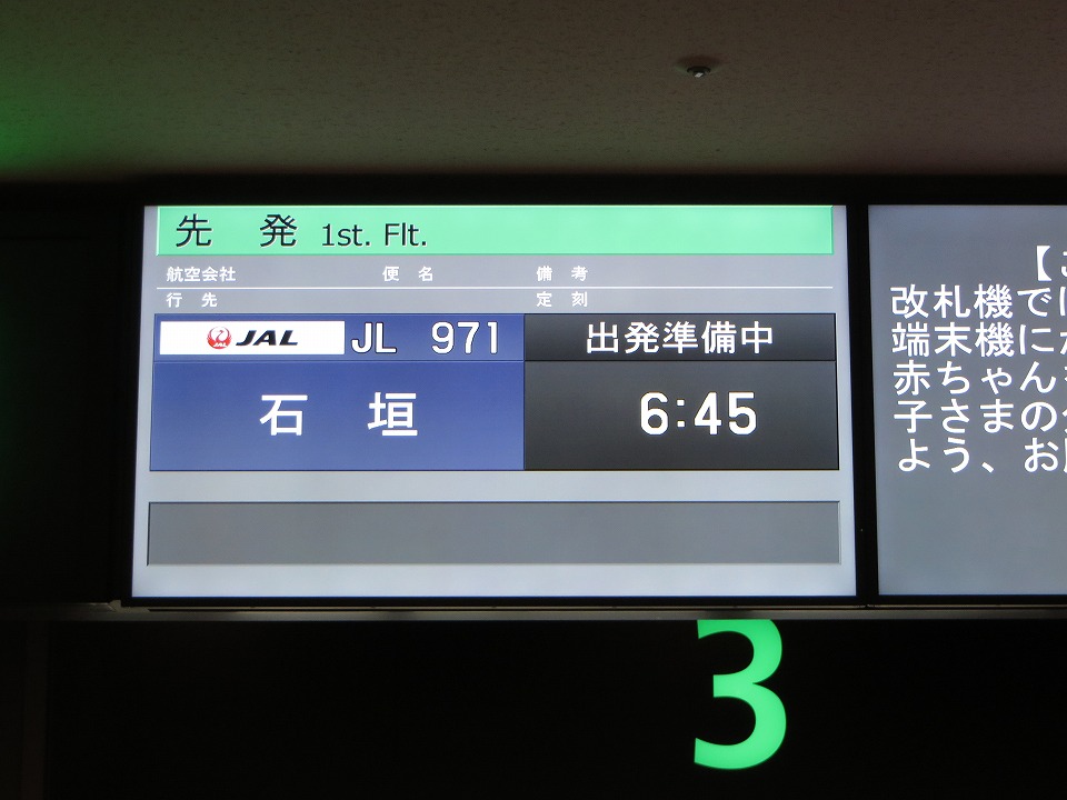 | JAL971便は3番搭乗口からの出発だ。 保安検査場をチャチャッと通過して・・・と思っていたら、出張や旅で使っているバッグに 調理用の100均の包丁が入っていることが発覚し(自宅で取り出し忘れていた。)、 女性警察官に銃刀法違反、もとい、銃刀法の関係で簡単な事情聴取を受けてしまった。 包丁は調理用ということで確認してもらい、その場で放棄して一件落着。 以後気を付けます。 |