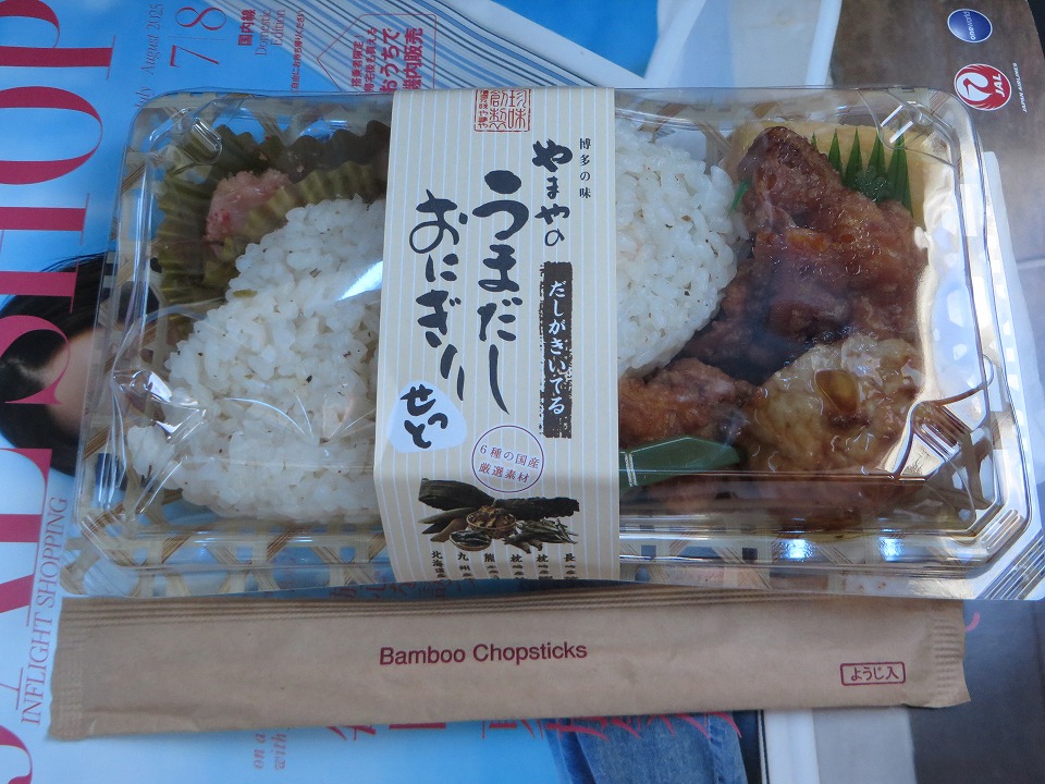 | 少し遅れてフライトした。 早速、朝メシにする。ダシに"こだわって"いるようだが、俺にはちょっとしょっぱかった。 化学調味料を使っている「調味料(アミノ酸等)」の表示があるが、ダシに"こだわって"いるなら使わないで勝負しろよ。 |