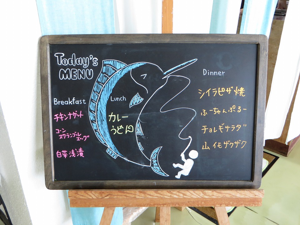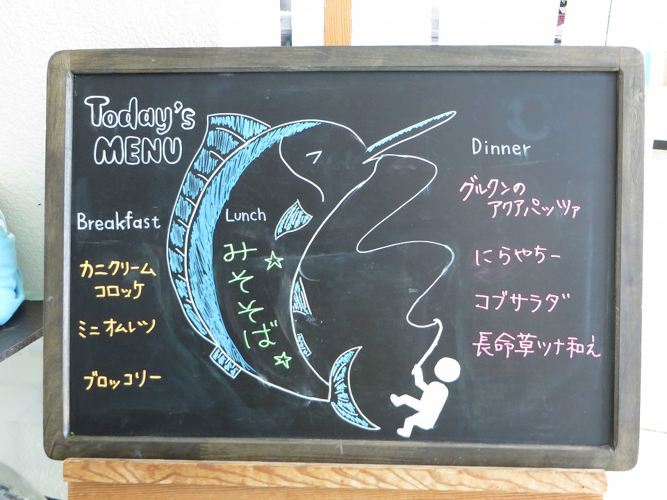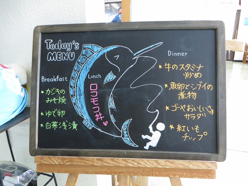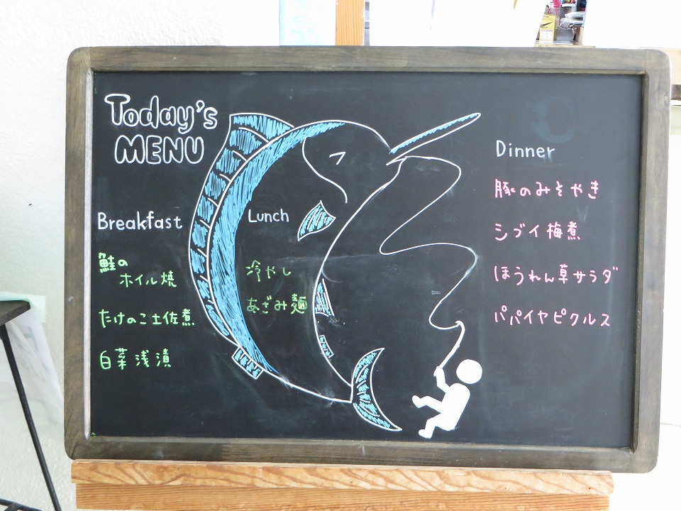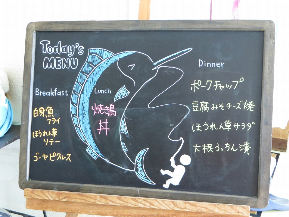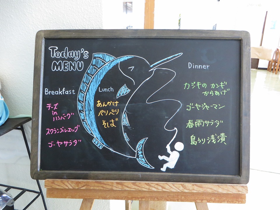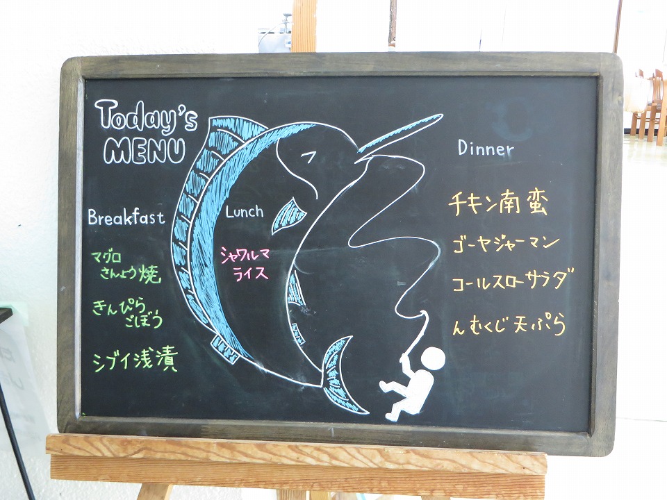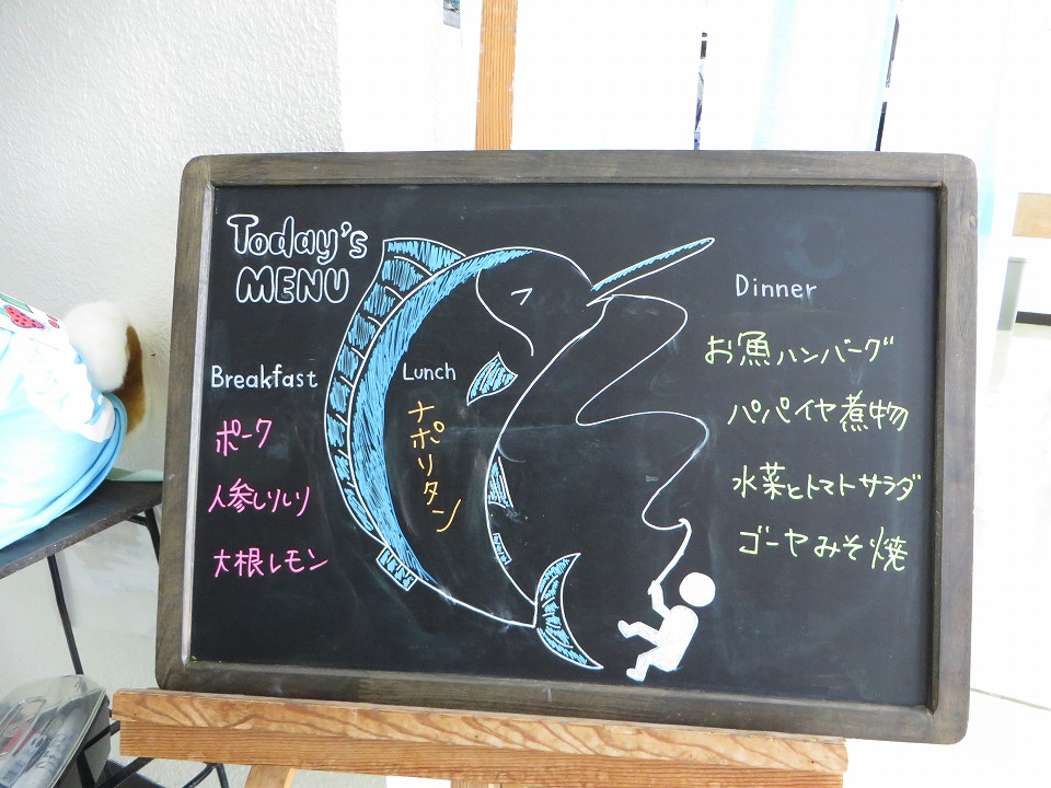 | YDSのスタッフが空港に迎えに来てくれていて、クルマで着いたよ~。 昼メシまでもうちょっとなのだ。 このボードの魚は、カジキを描きたかったんだと思う(笑)。 |