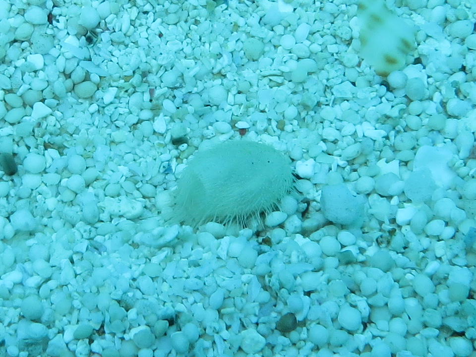 | 砂地をちょっとほじくったら出てきた、ミニサイズのブンブクん。2cmぐらいかな。 カメラのストロボの光がロクに届かなかったので、手持ちのライトを準備していたら、 あっという間に潜っちゃったんで、すぐまたほじくったのだが見つからなかった。 どこ行った? |