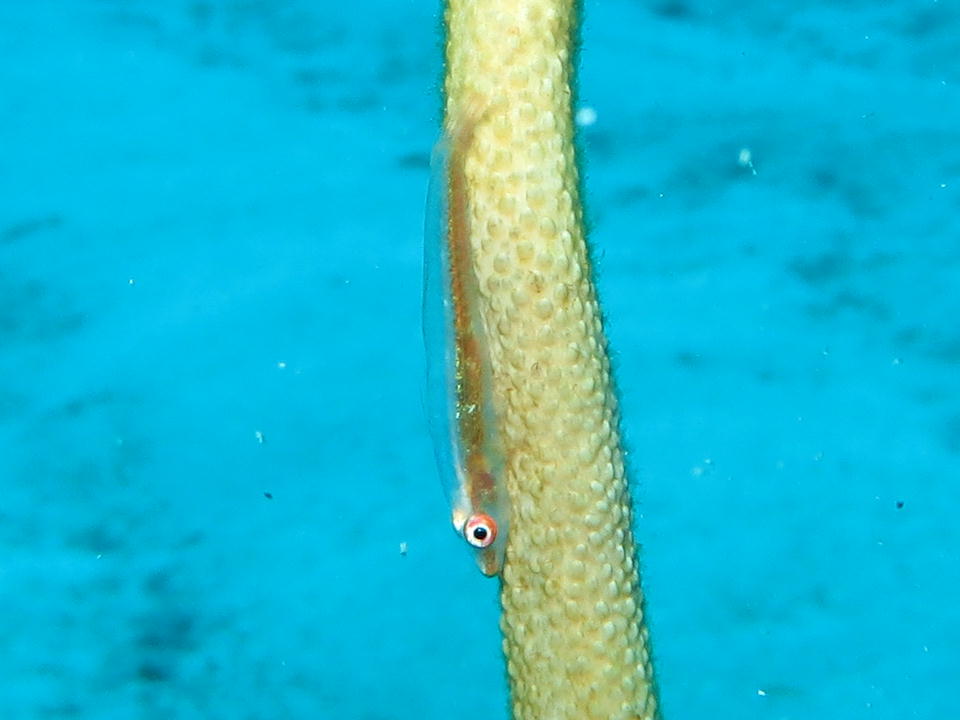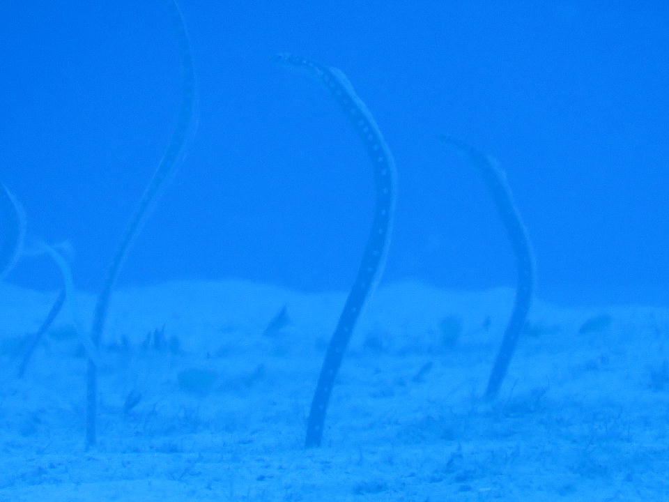 | 北東の根の近くにいるホワイトスポッテッドガーデンイール。 う~ん、カメラがピントに迷って、ロクに撮影できなかった。光量が足りなかったかな。 おまけにハウジングのボタンの一部が効かなくなってしまい細かい設定ができなかった。 -45m程度なので、ハウジングのボタンが水圧でやられてしまうというのはあまり考えたくないんだけどな~。 またリベンジしたい。 |