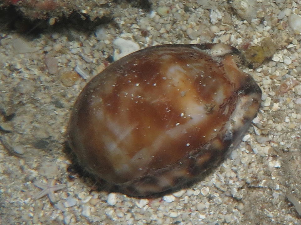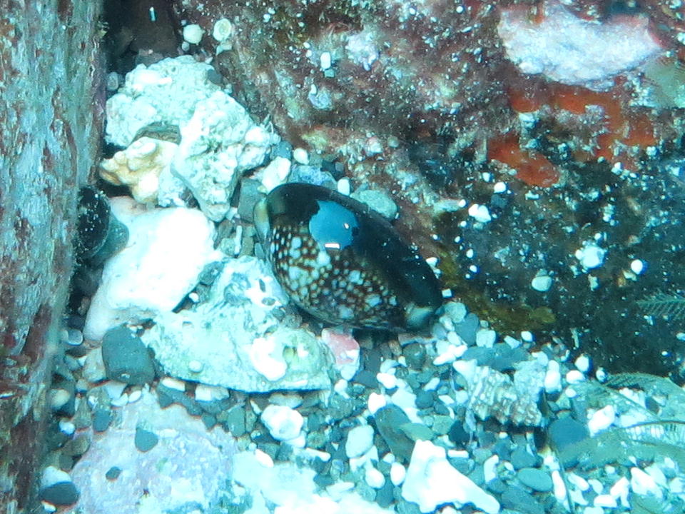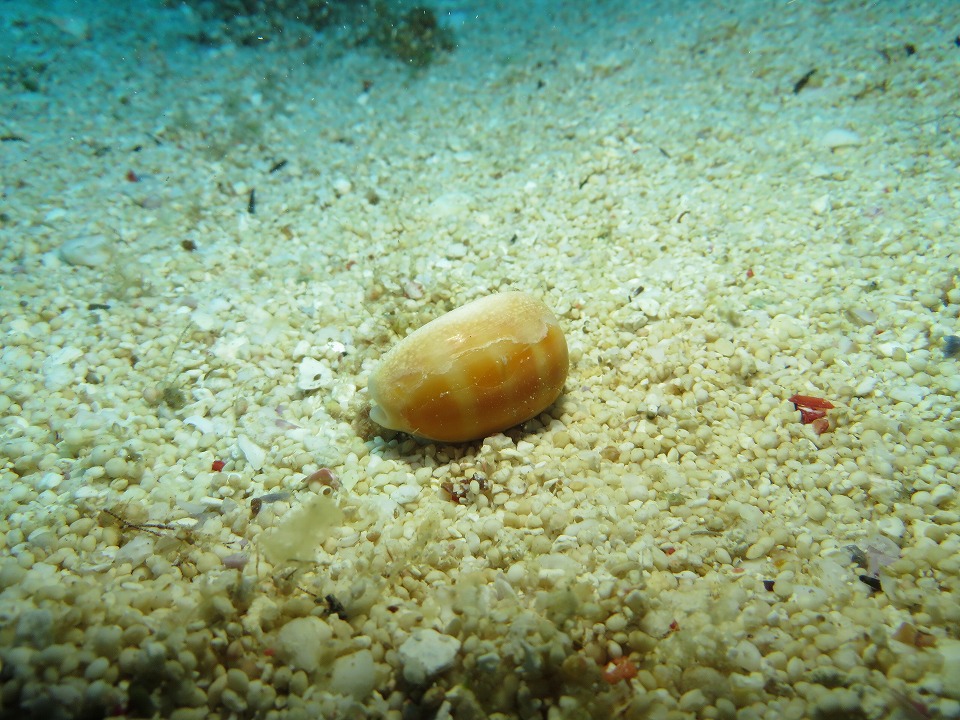| "奉納品"のD.C.は、スタッフも含めたダイバーみんなで探してくれる。 誠に有難う存じます。 どこかの岩の上に置いたのは間違いないし、この場所は流れの影響を受けないので、 多分そのままになっていると思う。だから、あまり慌ててはいなかった。 先にでっかいタカラガイを見つけたので,、こっちの記録の作業をした。 |