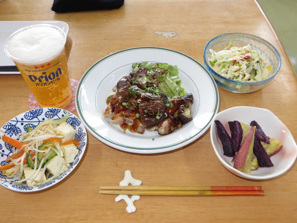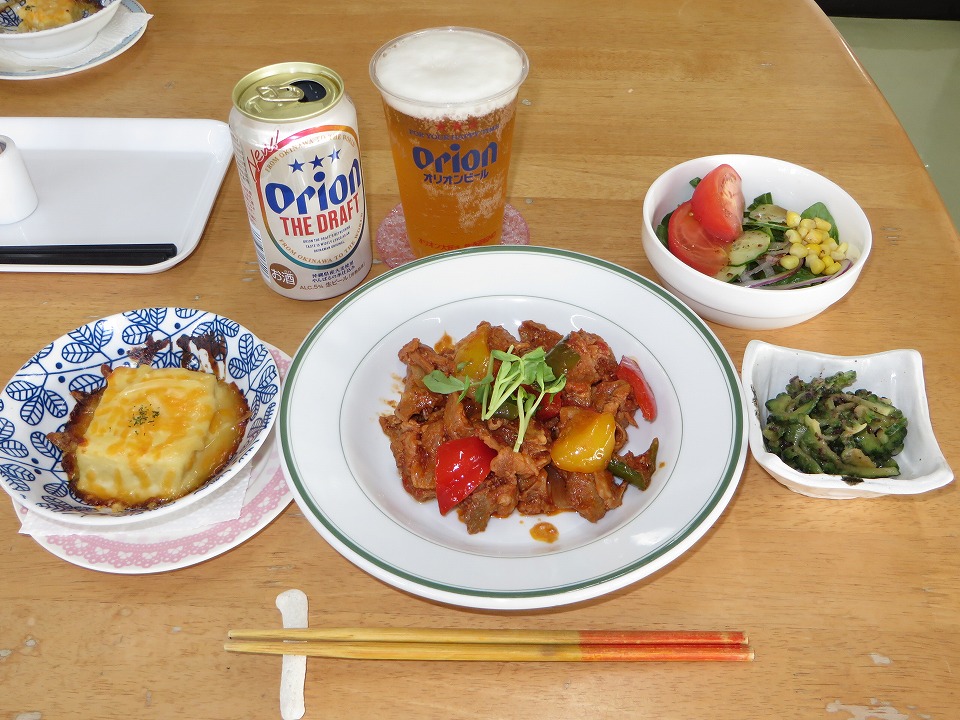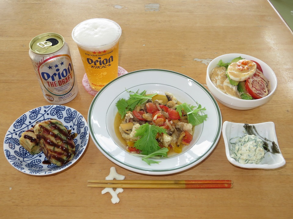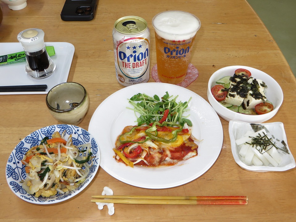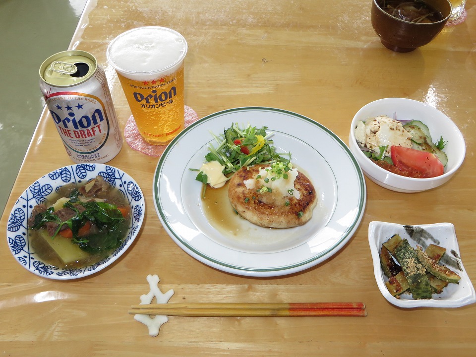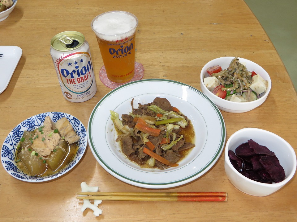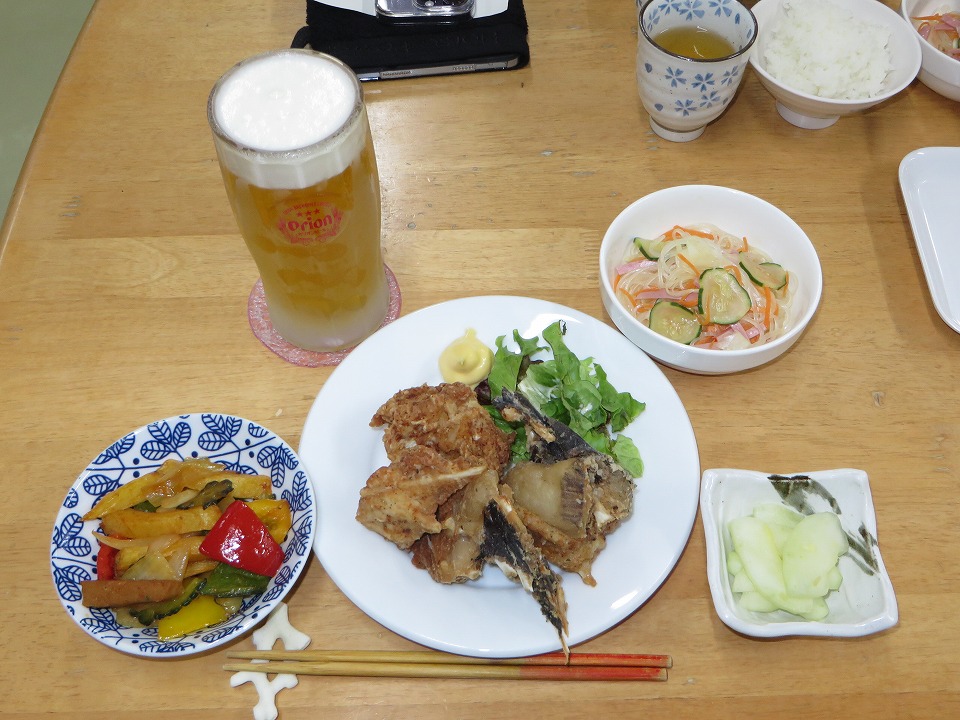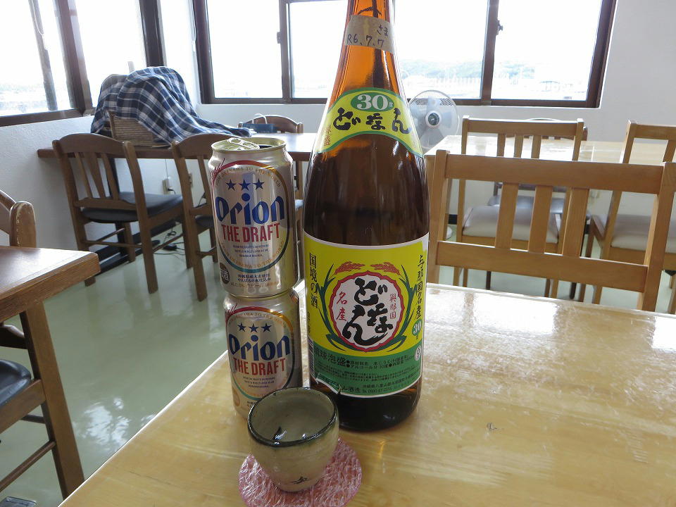 | 18:30になって、やっと晩メシ。 自分ルールで、最後の晩餐のときはオリオンの生を呑む。 カァ~~~ッ、効くねぃ! |