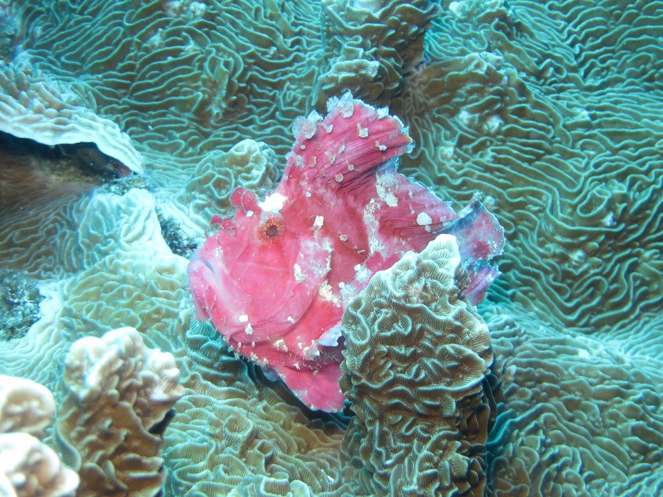 | 赤い個体のハダカハオコゼ。 手前のサンゴが邪魔だったが、いかんともしがたかった。 |