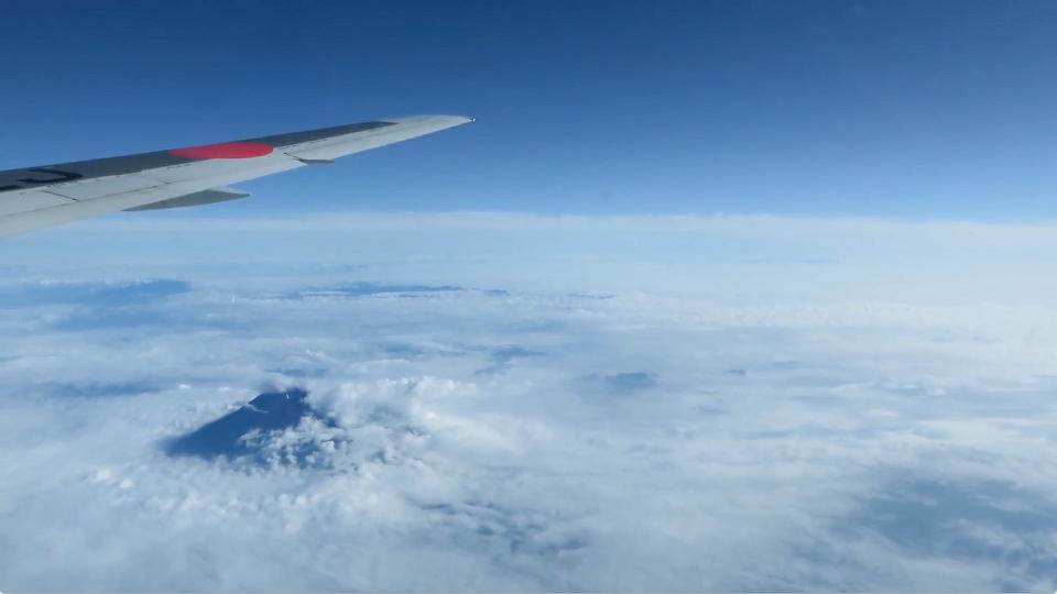 | 神奈川から静岡周辺はずっと雲の上だった。 富士山は雲海の上に顔を出していた。 ♬あ~たま~を~く~もぉ~のぉ~う~えに~だぁし~、だね(笑)。 富士山の横を通過するだけの約1分動画はこちら。 |
