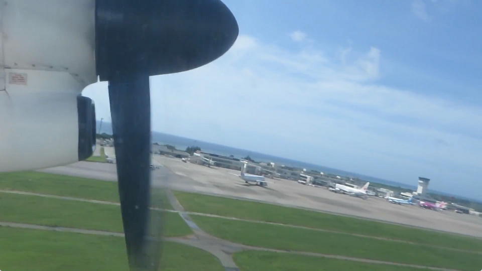 | 石垣空港を離陸する様子の約1分30秒の動画はこちら。 コンデジを窓に押しつけて、できるだけ揺れないようにガンバったんだけど、やっぱ結構揺れちゃいました。 |