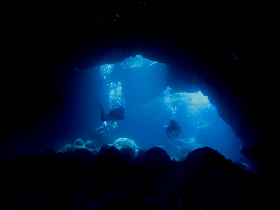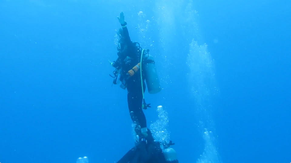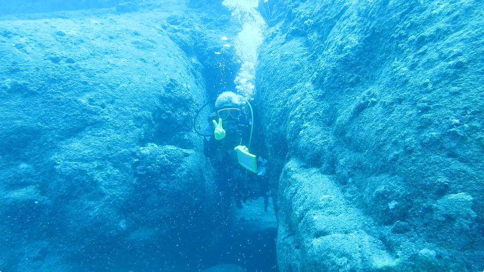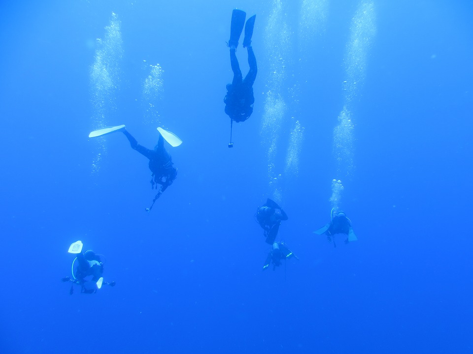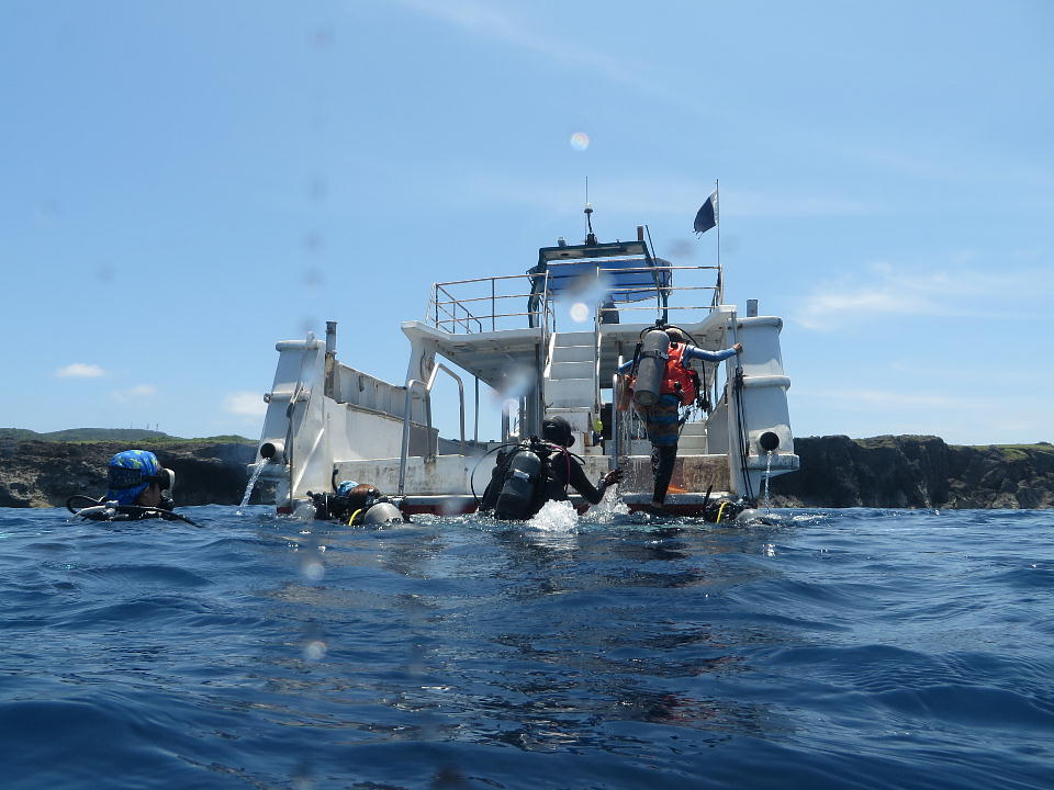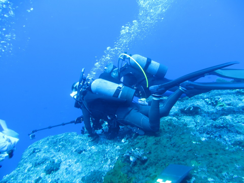 | 2本目は、開発中の地形ポイントの東崎ブルーホールで潜る。 ポイント調査も兼ねているので、YDSは船長以外のガイド全員が潜る。 みんな、動画で地形の様子を撮影したり、スレートにMAPを書いたりしている。 俺も新潟の親不知ではMAP作りをしたっけ。懐かしいな。 |