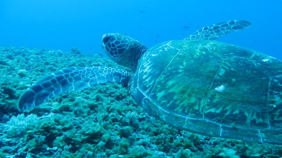 | ウミガメくんと並泳。 約30秒の動画はこちら。 |