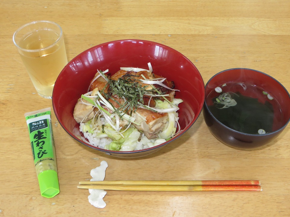 | 昼メシの焼き鳥丼。 わさびをピリリと効かせて、まーさんどー。 箸置きが朝メシのときのものとは違っているのを見逃してはいけない。 |