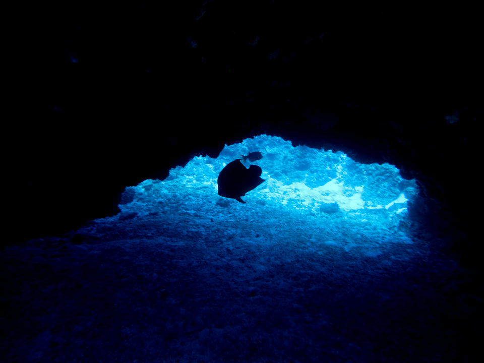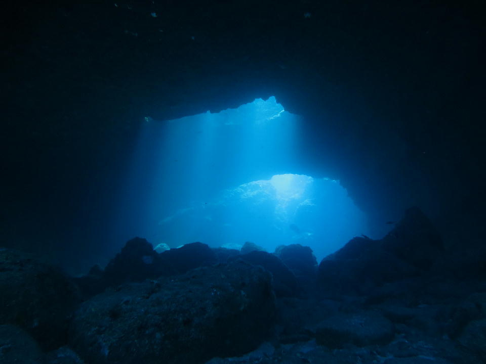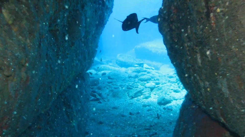 | 海底遺跡では、まずご挨拶的に城門をくぐる。 俺は先回りして、城門をくぐってきたダイバーを動画撮影した。 そのうち、先頭を切ってくぐってきたガイドのヒロキチの部分の約12秒の動画はこちら。 |
