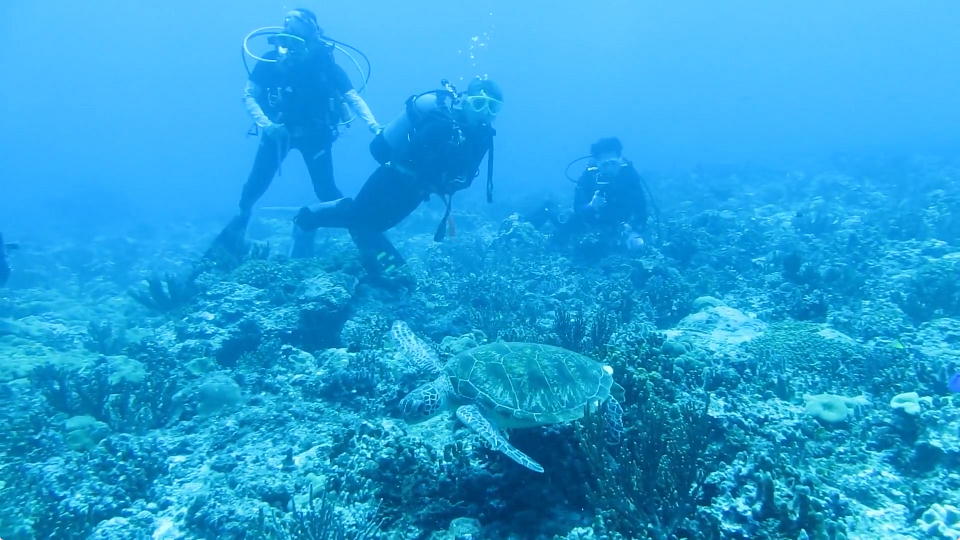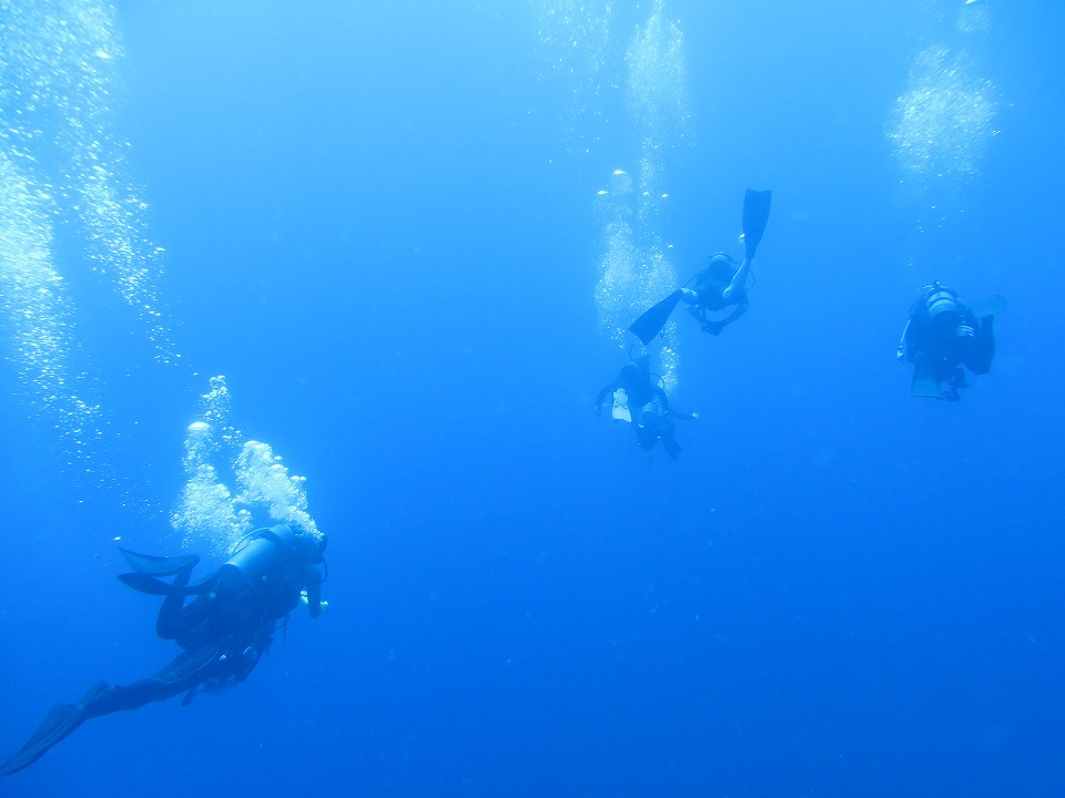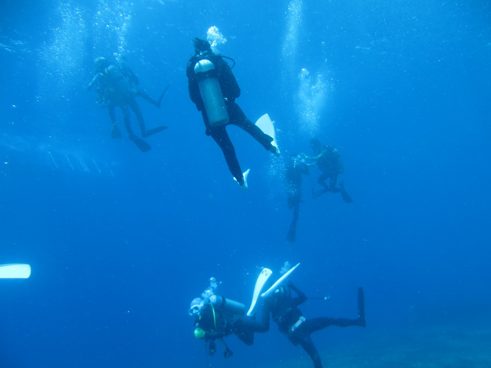 | EN直後。体験さんの潜行をサポートするスタッフ。大変だね。 今日は逆潮なので、亀のモニュメントからのスタートだ。 |