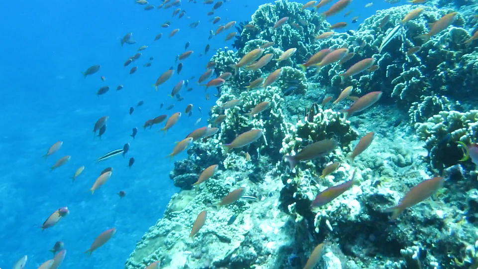 | アーチから出てきた棚上にはキンギョハナダイが群れていた。 約10秒の動画はこちら。 |