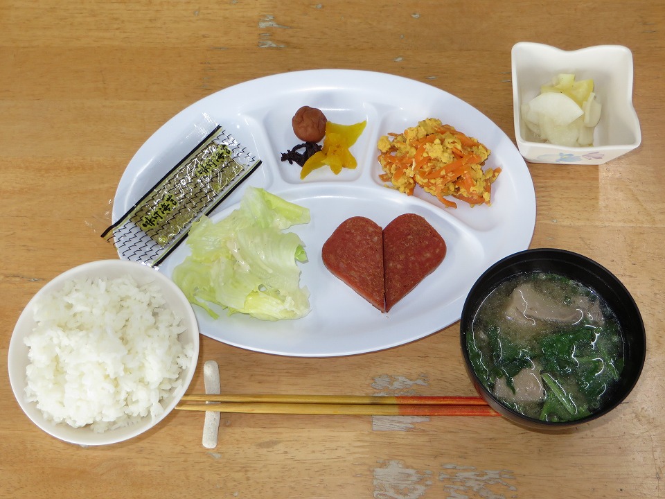 | 朝メシ。いつものことだが、ポークを♡型に並べてくれる。 こういうちょっとしたところが、YDSのスタッフのいいところなんだよね。 |