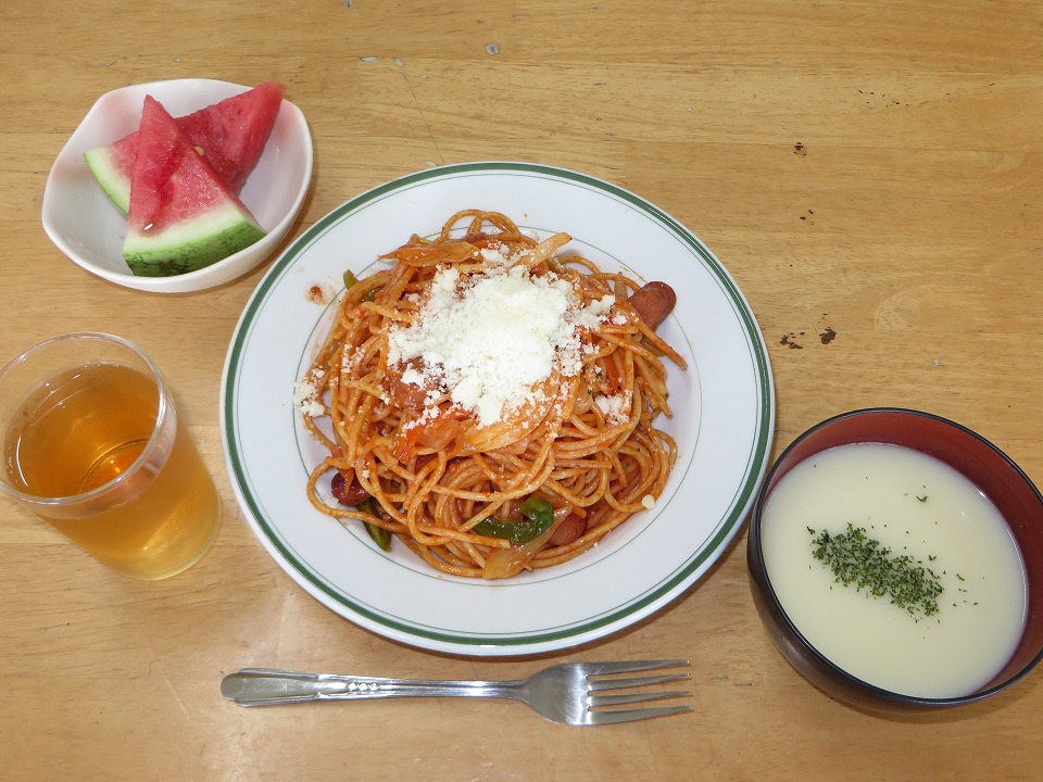| 昼メシは俺が大好きなナポリタン! 大盛を食した後、また"ほぼ大盛"をお代わりした(笑)。 なんべんも書くが、俺はギッチョだから、スプーンの置き方は、こう。 あ、味噌汁椀のポタージュスープを飲むためのスプーンもちゃんと用意されていたからね。 |