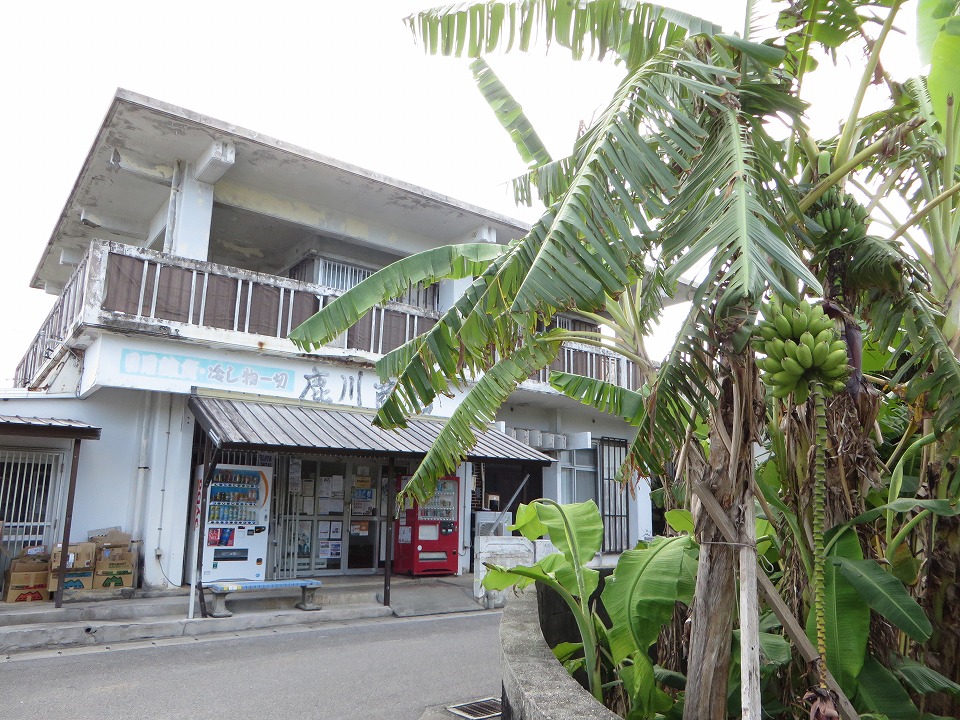 | 1本目までの間に、久部良簡易郵便局へレターパックを出しに行った。 その帰り、港近くで、これから空港に向かいそうないかにも内地からの観光客のカップルが 「こんにちは。」と挨拶してくれたので、うちなー訛りっぽく「もうお帰りですか。お気をつけて。」と返してあげた。 うちなー訛りっぽく「またいらっしゃいね。」とでも付け加えたらよかったかな(笑)。 あ、この写真は、いつもアイスやお菓子を買いにくる鹿川(かがわ)商店と、島バナナの木。 |