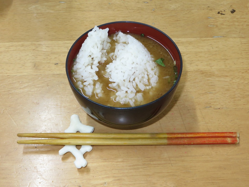 | 〆に、コメ、お肉の残り(にゃんこメシにした。)、御味御汁(にゃんこメシにした。)。 おなかいっぱい。 あらーぐまーどぅあたる! |