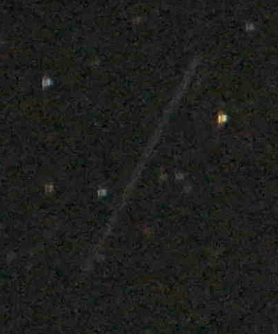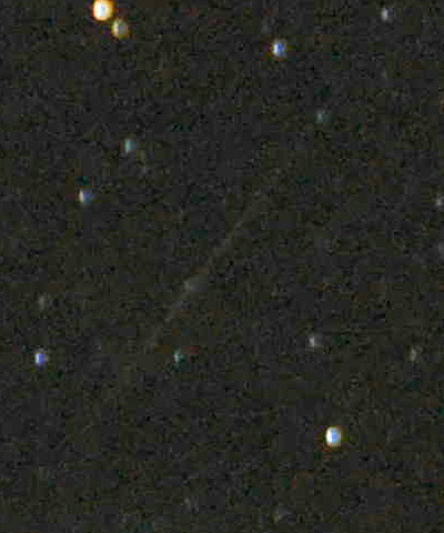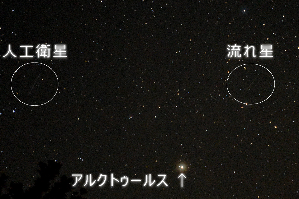 | さそり座での流れ星ににすっかり満足したら、久部良岳の近くに移動して、今度は北~西方向を撮影した。 すると、またしてもシャッターを開けているタイミングで流れ星があった。 流れ星は肉眼ではハッキリ見えたので、またバッチシ写っているだろうと期待したのだが、 写真を見てみると、写っていることは写っていたが、細い線でちょっと写っているだけだった。 ↑の写真は、原版から人工衛星と流れ星とアルクトゥールスの部分をトリミングしたもの。 たまたまだが人工衛星も一緒に写っていて、しかも軌跡の角度や長さがほぼ同じ(=露光時間が同じにみえてしまう。)だったので、 肉眼で流れ星を見ていなければ、どっちも人工衛星と思われちゃうだろうね。 でも、人工衛星の軌跡は光線の太さが同じだが、流れ星の軌跡はたいてい、"細~太~細"になるので、拡大してよく見ると違いが分かる。 それらが下の2枚。どちらも原版のサイズのままでトリミングしたもの。