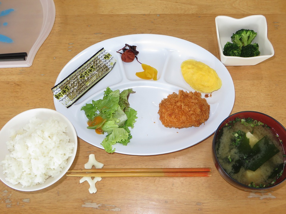 | 写真では分かりづらいが、かにクリームコロッケはころんころんした大きさだよ。 コメをお代わりしたかったが、1杯だけでガマンした。 |