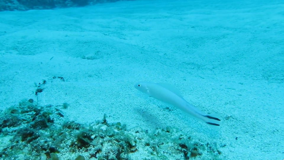 | 砂地からドロップオフに落ちる際でユラユラとなまめかしく泳ぐヤセアマダイ。 約10秒の動画はこちら。 |