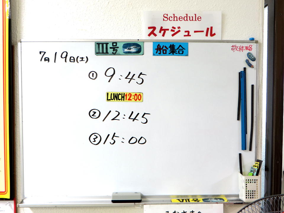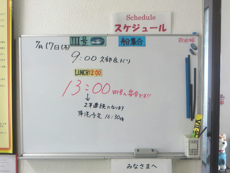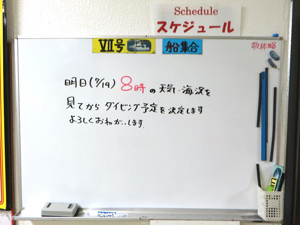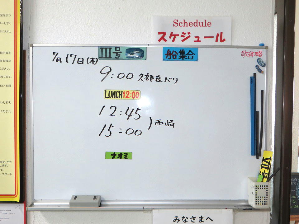 | 今日のスケジュール。 ゲストのダイバーは俺を入れて2人だけなのでホワイトボードに名前はない。 ゲストの個人名が書かれていないから、この写真は堂々とUPできるね(笑)。 午後は、連チャンで西崎か~。大物狙いだね。 俺的にはテンション上がらんな~(大物は基本的に興味がないのよ。)。 |
