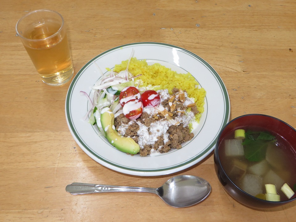 | 昼メシ。 シャワルマ-ライスというものだそうな。 ザックリ書けば、サフランライスにそぼろ肉を書けたもの。 まーさんよー。 |