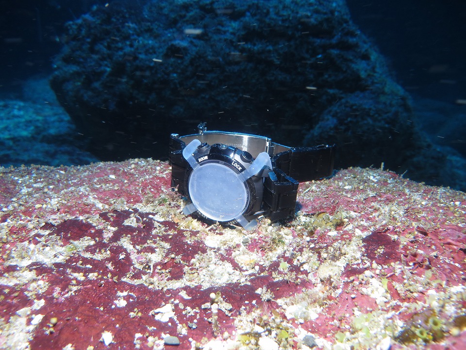 | あった! 見つけたダイバーが俺に教えてくれた。 前もって、「写真を撮るから、見つけても俺に持ってこないで俺に教えてね。」と伝えておいたので、 これは見つかったそのままの状態。 ひとつフシギなのは、D.C.の表示面を上に向けて置いていたのに、横を向いた状態で発見されたこと。 |