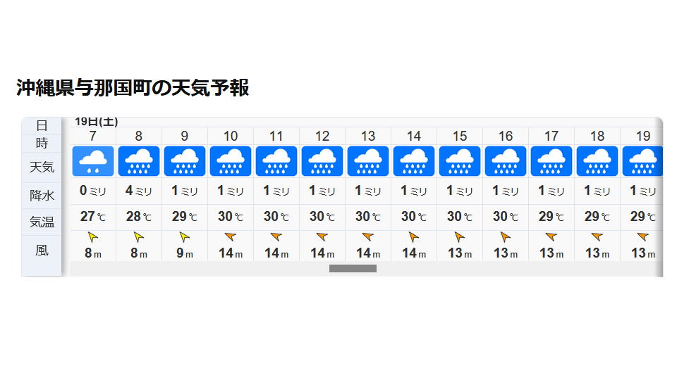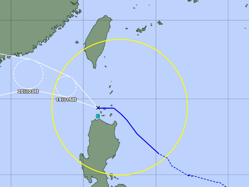 | 台風6号が台湾とフィリピンの間に差しかかっている。 台風の東側に当たるやいまは南寄りの風が吹き付けるので、 この先海が荒れてくると思われる。 |