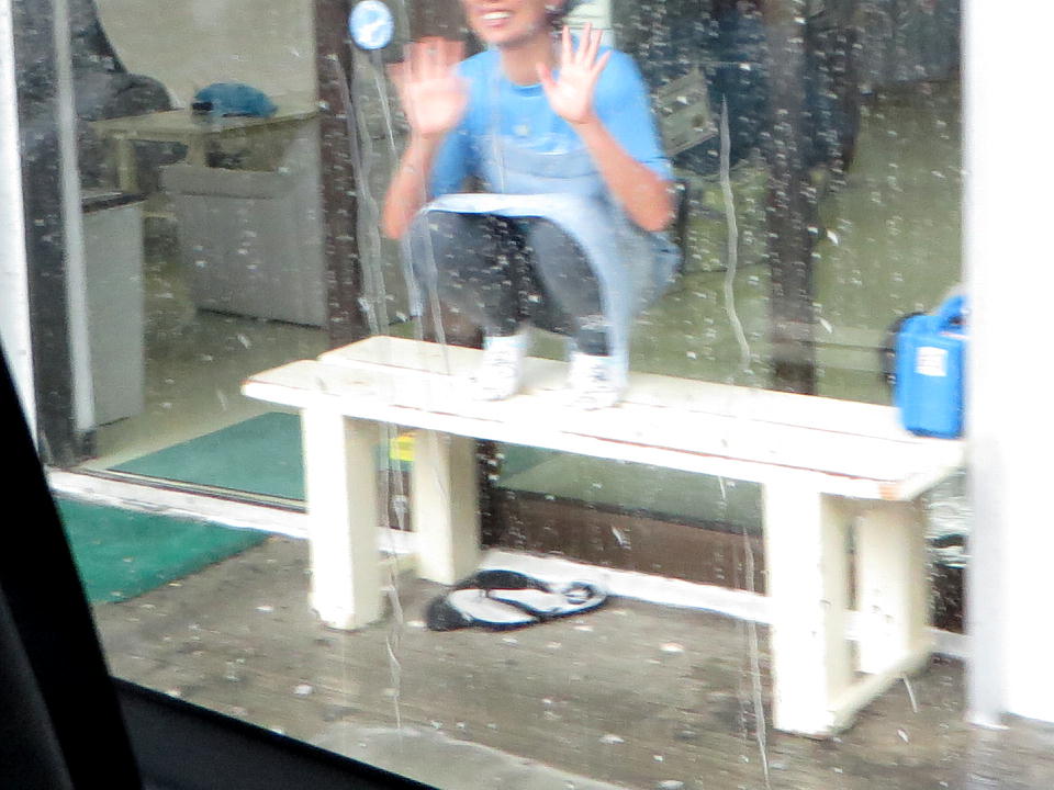 | さて、YDSに別れを告げて、空港に向かうよ。 緑さんが見送ってくれたが、雨が強くて靴下が濡れるのを避けるために、ベンチに上がってしゃがんでた(笑)。 この姿がかわいくて急いでコンデジを取り出して撮影したのだが、もうクルマが発車していたのでブレてます。 なお、お顔の部分はトリミングしました。 1週間ありがとうございました。今回もまたたくさんのご迷惑をおかけしましたが、とても楽しかったです。 |